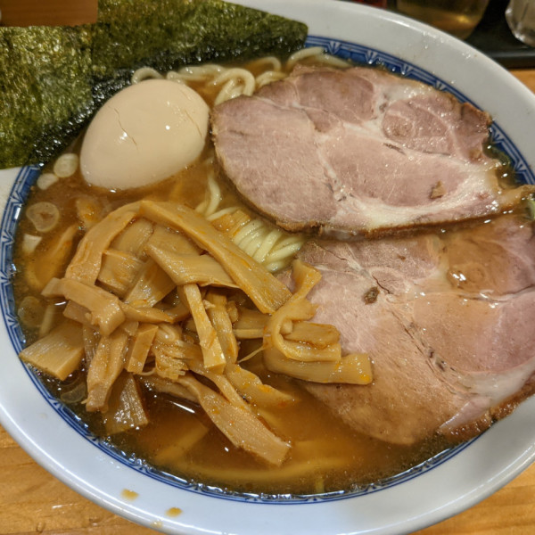 東京都板橋区上板橋1-25-10マップで見る中華そばは、豚骨魚介系のスープはやや大勝軒に似ている。分厚くスライスされたチャーが2枚これは旨し。支那筍は細めにカットの歯応えよし。旨し。