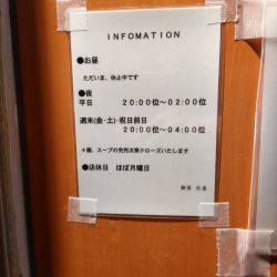| 営業時間 | 20:00〜翌2:00 [金・土・祝日前日] 20:00~翌4:00 ※売り切れ次第終了 |